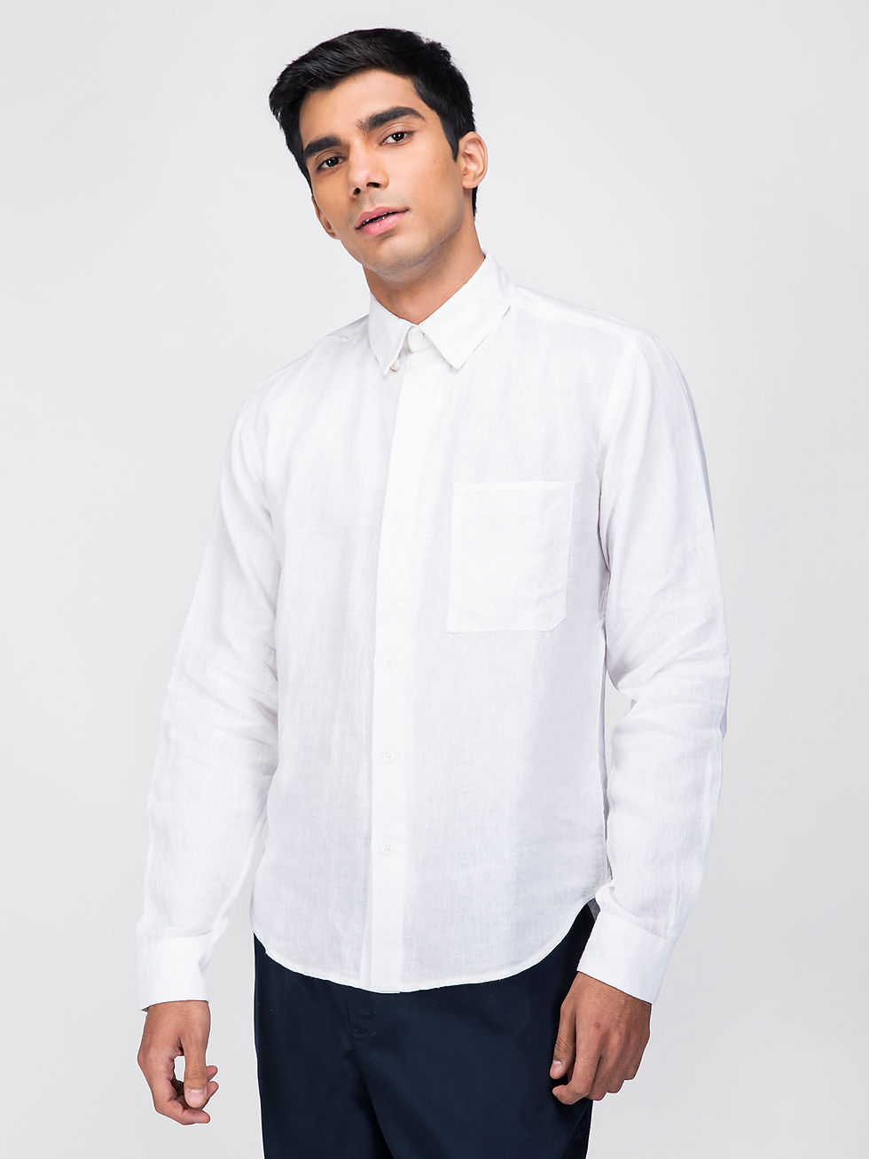 The Minimalist | White Linen Mandarin Collar Fitted Shirt